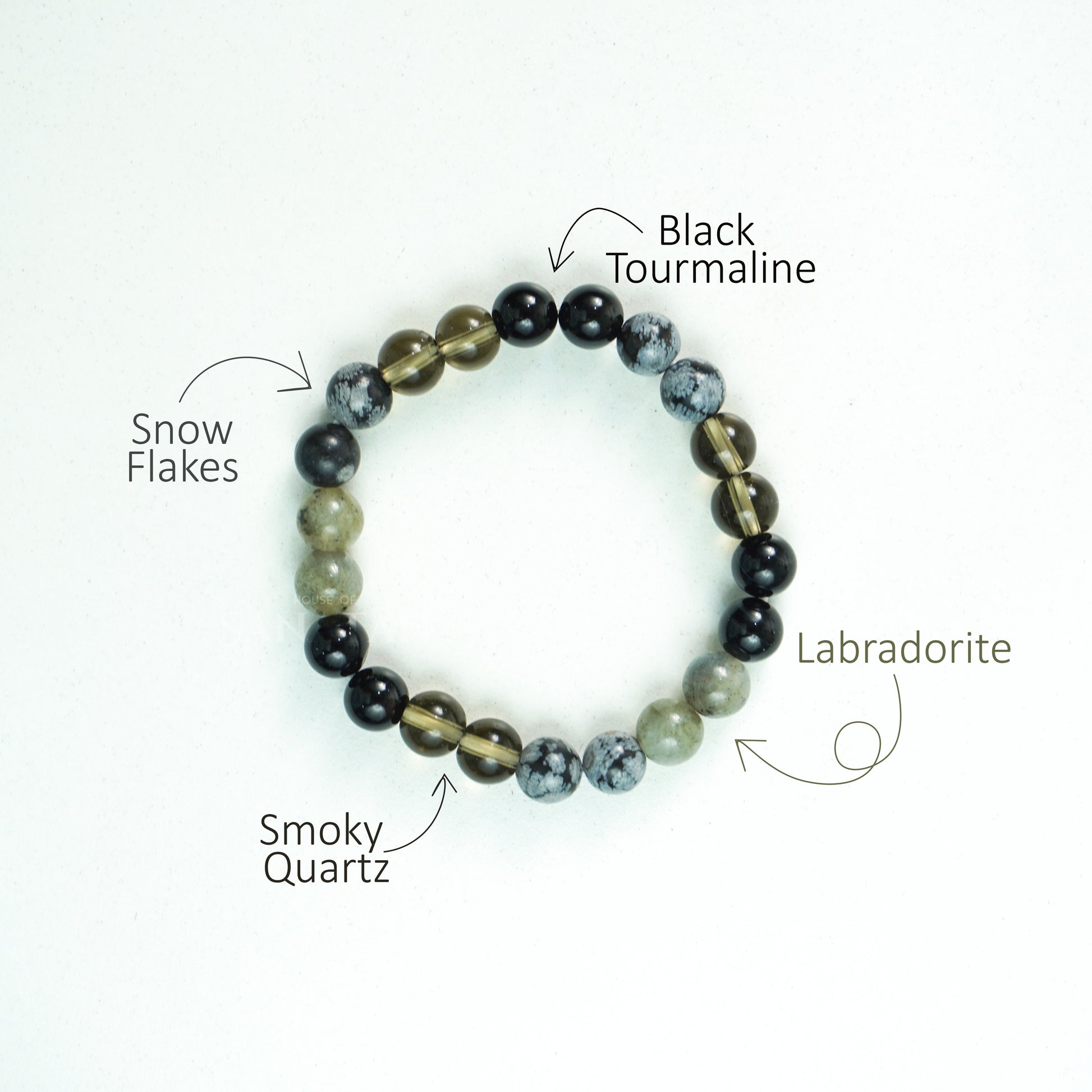 This spiritually potent bracelet is crafted using crystals such as Snow flakes , Smoky Quartz , Labradorite and Black Tourmaline —chosen for their ability to calm the mind, dissolve ego attachments, and support profound inner transformation. Perfect for those in Ketu Mahadasha, or on a path of intense spiritual evolution.