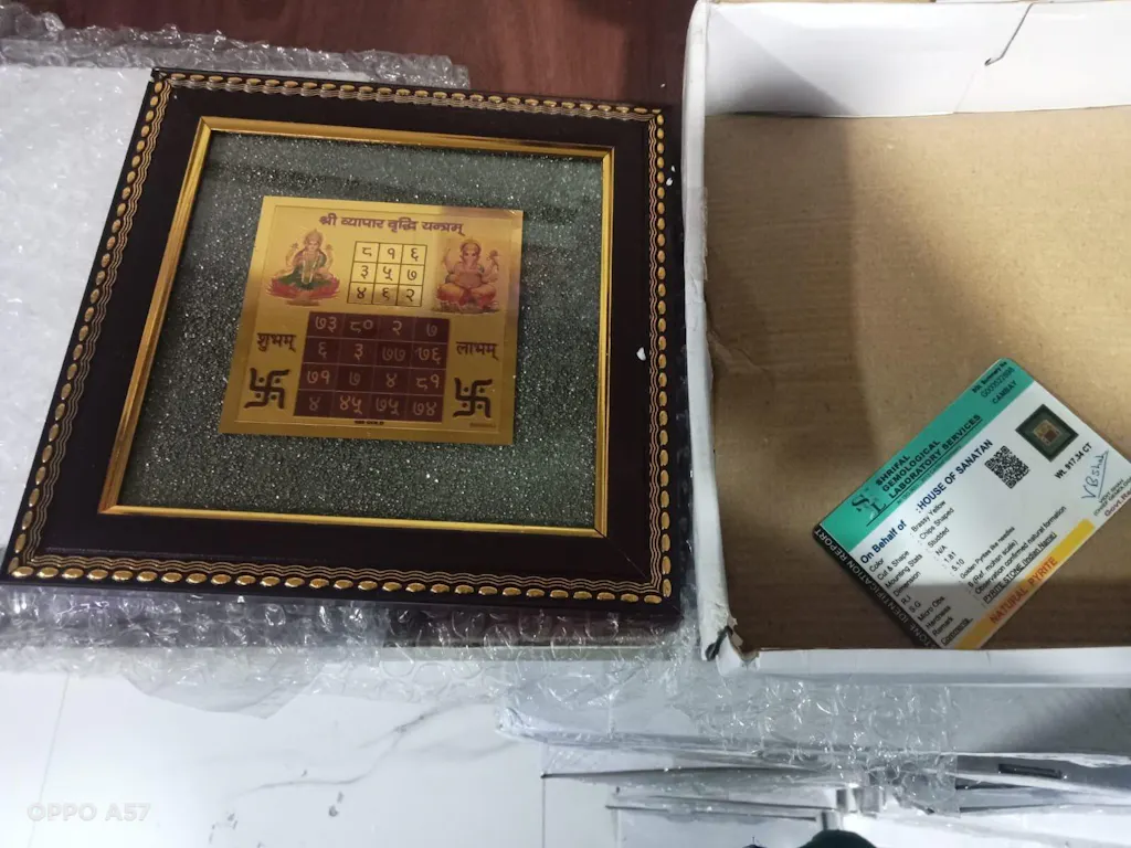 Elevate your space with this business-focused masterpiece — the Vyapar Vriddhi Yantra on Raw Pyrite Frame from House of Sanatan helps you align your ambition with divine support and manifest growth with intention.